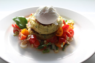 Bratlinge, Salsa und Ei auf dem Teller anrichten.